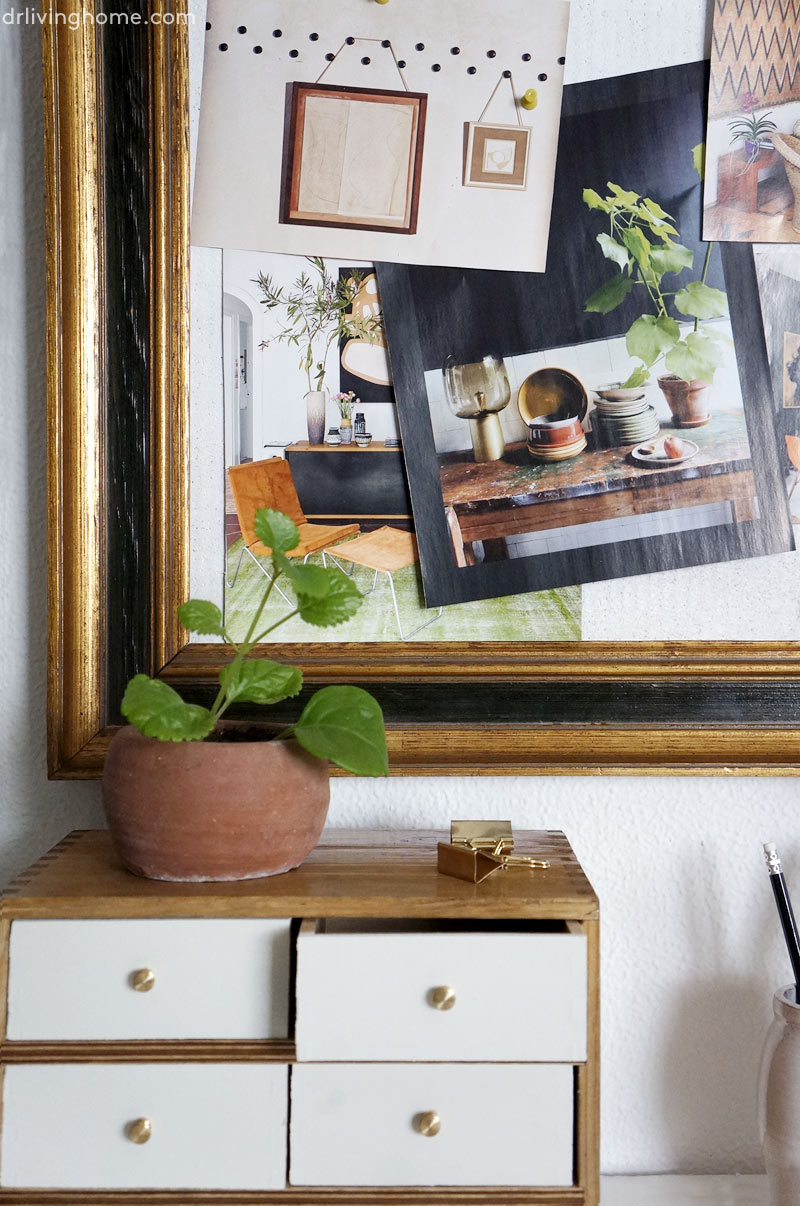 Un corcho así a secas no me resultaba muy glamuroso, ni muy bonito y me parecía que quedaba un poco de cuarto de adolescente, así que le añadí un marco antiguo. El jueves te cuento cómo hacerlo, es un diy muy fácil y queda genial.