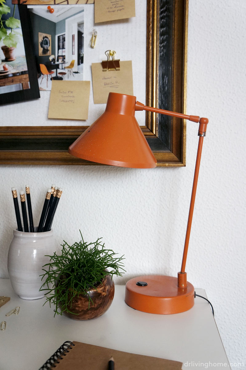 Dudé un poco porque es de color naranja y el naranja no es un color que me atraiga pero con esa forma tan bonita y por ese precio… no me pude resistir. Me llevó sólo una hora ponerle el casquillo nuevo y colocar otro cable y, si algún día me canso del color, siempre puedo pintarla.
