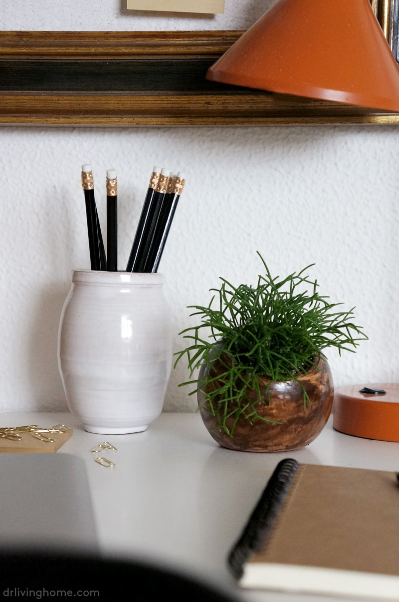 Si tienes una pequeña oficina en casa como la mía escoge cuidadosamente los lápices, los bolígrafos, el lapicero, los clips, etc. Haz de todos esos pequeños objetos útiles, tu decoración. Establece una paleta de color y un estilo o estilos y escoge todos esos accesorios de acuerdo a ellos.