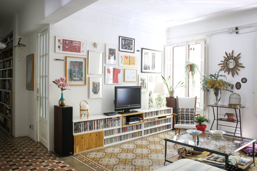 Este piso en Valencia con una decoración estilo boho (que ahora está muy de moda, irónicamente) me ha encantado porque parece decorado con mucha libertad. ¿Cuánta gente se atrevería a decorar su entrada combinando una alfombra de flores con un papel pintado tropical? ¿Cuánta se atrevería a decorar su habitación con dos mesillas diferentes o a colocar un tapiz en el comedor?