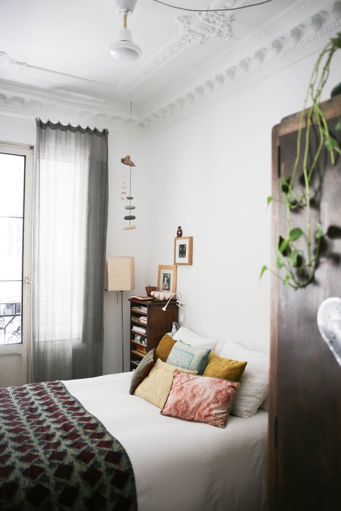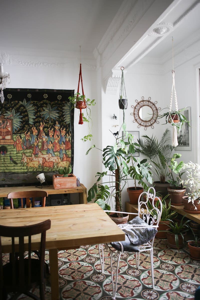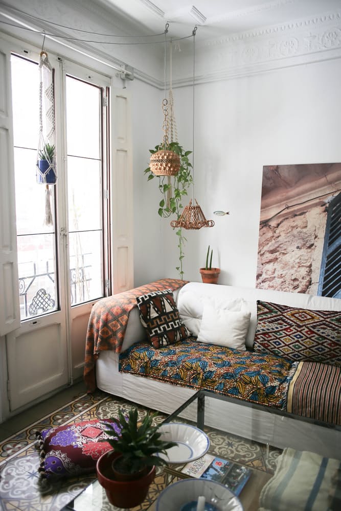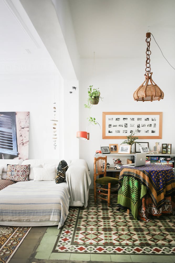 Este piso reúne todas las claves del estilo boho: espontaneidad y relajación (una especie de desorden ordenado, que no todo combine a la perfección), mezcla de estilos y estampados (sobre todo étnicos), muchas plantas, artesanía y materiales naturales (mimbre, madera, cerámica) y decoración por capas.