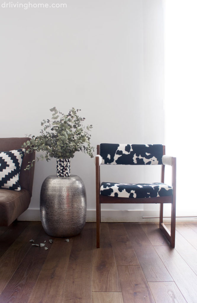Esta silla la encontré en el Rastro con bastante mala pinta. El barniz estaba en mal estado, el tapizado era horible y también estaba mal… pero la estructura me encantó. Igual que me encantó la tela cuando la vi (por fin he aceptado que imita la piel de vaca, aunque yo siempre he visto manchas de tinta a lo test de Rorschach). La renové completamente y considero que con el nuevo tapizado queda una silla a camino entre lo clásico y lo contemporáneo. ¿Quizá sea un diseño demasiado personal para que guste a muchos? ¿Quizá es que está completamente ajena a las tendencias? We’ll never know.