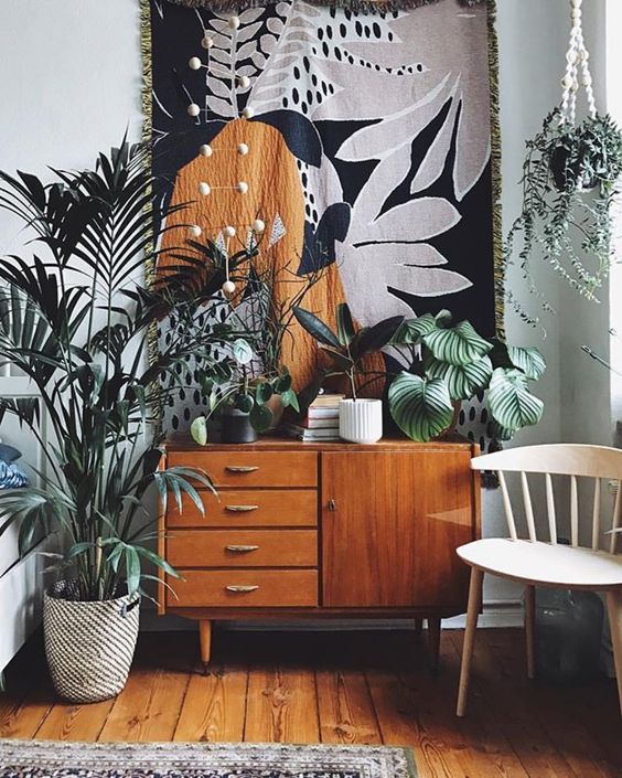 Me encanta decorar con plantas, ¡las tengo por toda la casa! Un sitio distinto y decorativo para colocarlas es en la pared. Puedes colocarlas en macetas, cestas, colgadas o hacer que una planta trepe por la pared como en esta imagen: